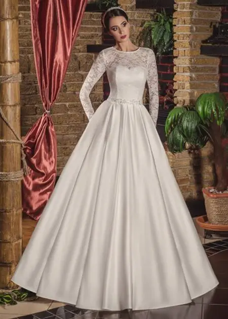 Seleccionar opciones Este producto tiene múltiples variantes. Las opciones se pueden elegir en la página de productoVestidos de novia, Vestidos de Novia Colección 2021, Vestidos de novia con cinturón, Vestidos de novia corte A, Vestidos de Novia Corte Princesa, Vestidos de novia de invierno, Vestidos de novia de manga largaElegante vestido de novia de invierno realizado con encaje en el busto de mangas largas y cinturón decorado con perlas