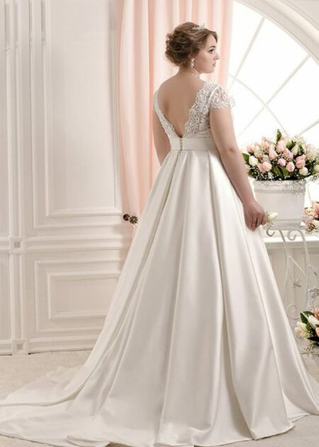 €392.59Abiti da Sposa, Abiti da Sposa A-line, Abiti da Sposa Collezione 2026, Abiti da Sposa Scollo a V, Abiti da Sposa Taglie FortiAbito da sposa 2021 taglie forti con corpetto in pizzo scollo a V e maniche corte, gonna ampia in raso con strascico corto