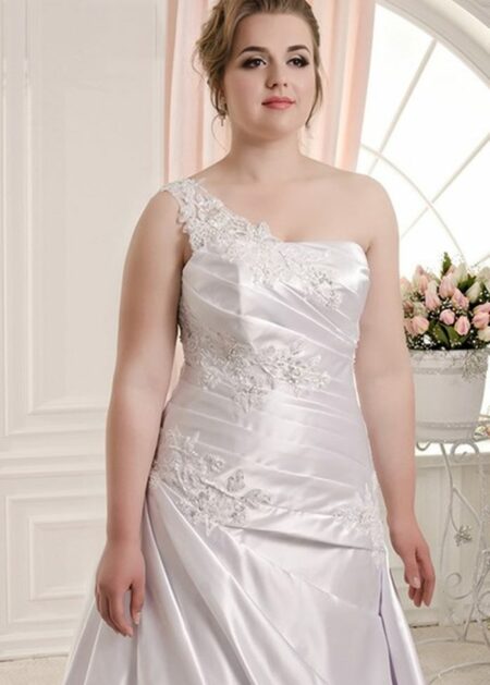 €425.90Abito da sposa per donne di taglie grandi monospalle in raso applicazioni di pizzo corpetto e gonna drappeggiate diagonalmente