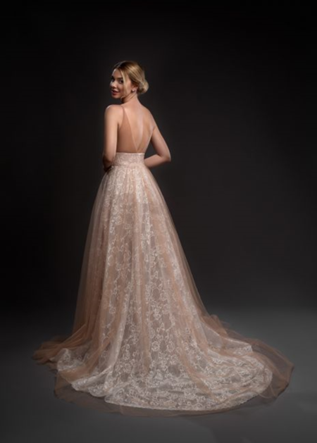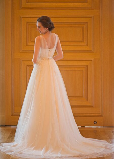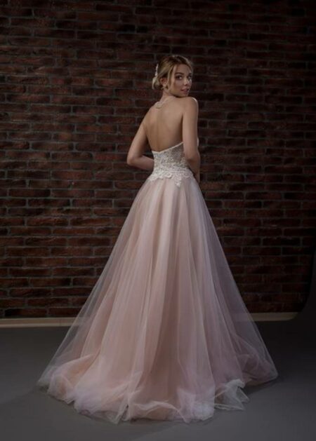 Abito da sposa con gonna in tulle colore cipria, impreziosito da un corpetto stretto in pizzo dallo scollo a cuore, reggiseno interno