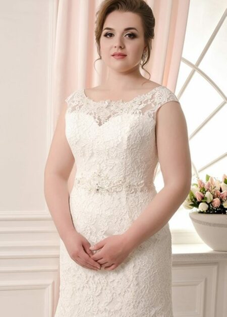 €427.78Abiti da Sposa, Abiti da Sposa a Sirena, Abiti da Sposa Collezione 2026, Abiti da Sposa Taglie FortiAbito da sposa taglie forti semplice stile sirena fatto in raso e pizzo con scollo a barca, schiena scoperta con profondo scollo a V sul retro