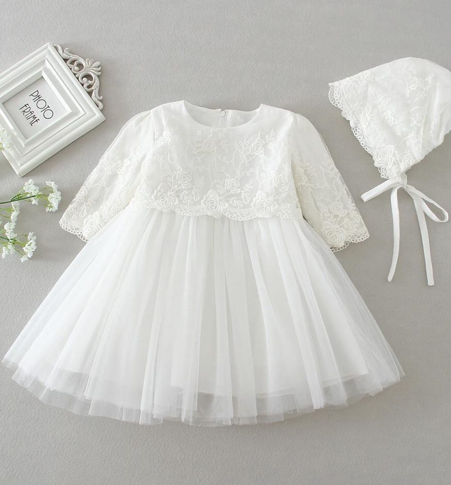 Abito da battesimo bimba online bianco in pizzo e tulle vaporoso con maniche tre quarti e cappellino di pizzo. Abiti battesimo in vendita online per il giorno più bello vesti la tua bimba con l’eleganza dei nostri abiti esclusivamente Made in Italy realizzati in tessuti pregiati. Abiti e abbigliamento da neonato ideale per le cerimonie e i battesimi.