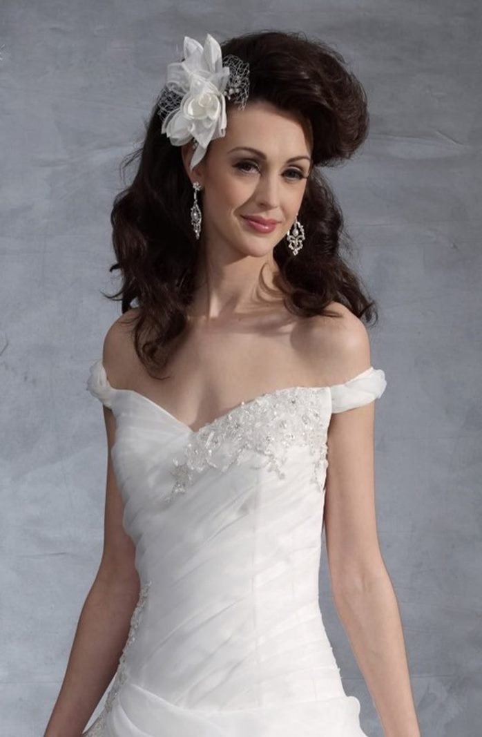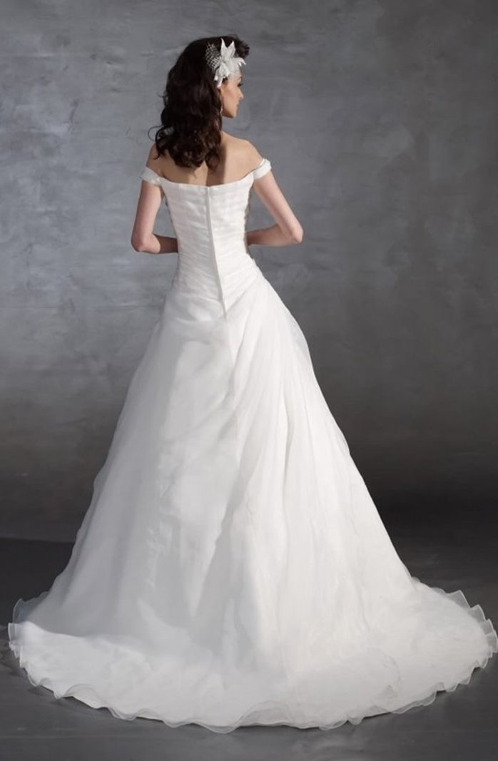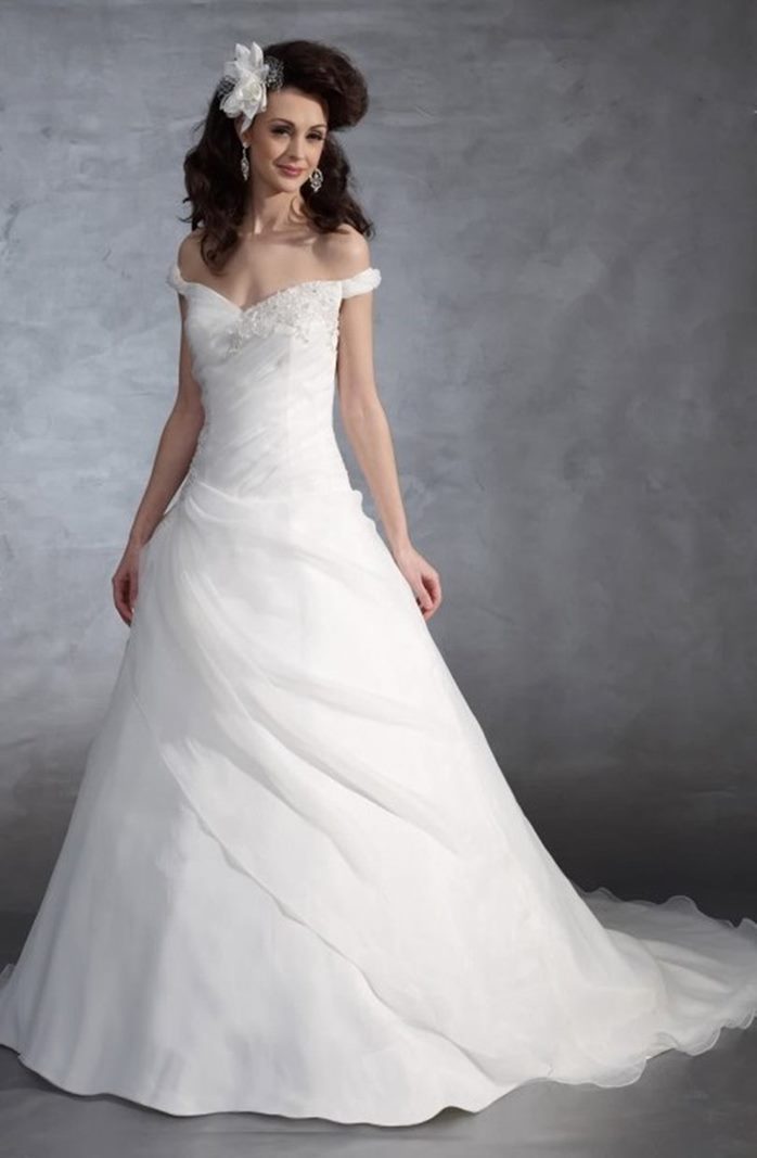 Abito da sposa classico ed elegante collezione 2021 stile A line dallo scollo a cuore con spalline cadenti. Il bustier drappeggiato diagonalmente, semirigido e preformato, è arricchito da pizzi e applicazioni preziose. La gonna a una fascia diagonale di tessuto, chiusura a zip. Strascico corto, per ottenere l’effetto principesco della foto è necessario indossare una sottogonna.