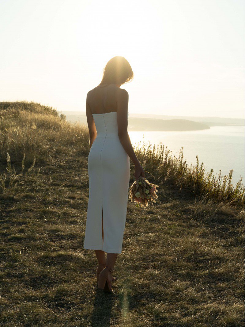Abito da sposa taglio dritto economico con scollo a V fatto in taffetà. Sul retro presenta una chiusura a cerniera con spacco sulla fine della gonna.