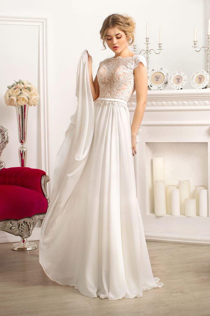 Bilbao – Abito da sposa di tendenza scivolato realizzato in morbido chiffon con cintura di raso e schiena scoperta. Il corpetto è caratterizzato da la fodera in raso colore champagne coperta da un leggero pizzo bianco che compongono le maniche corte.