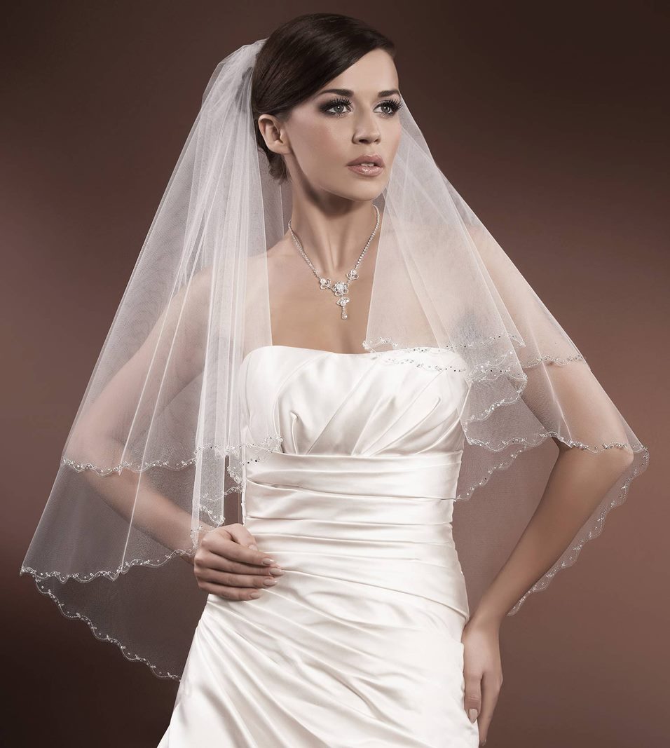 Velo da sposa semplice perfetto per abiti da sposa stile impero a due strati decorato sui bordi con punti luci. Qui troverai un catalogo online di veli da sposa da abbinare perfettamente al tuo vestito.